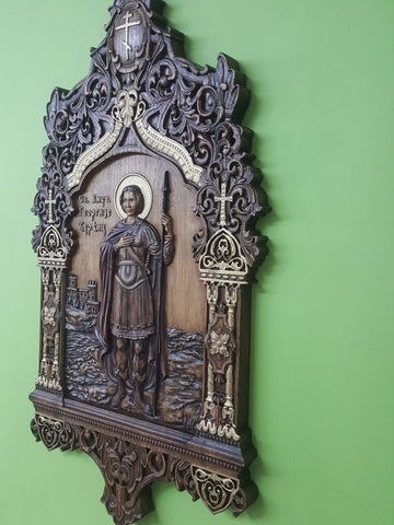 Ikona Sveti Georgije Djurdjic izradjena od hrasta dimenzija 73cm x 40cm x 4cm. Ikona je izrađena od hrastovog drveta, bajcovana u orah i zaštićena prirodnim uljem i pčelinjim voskom. Mogućnost izrade po Vašoj želji i od raznih vrsta drveta. Imajte nešto posebno u svojoj kući.
