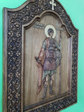 Ikona Svetog Georgija izrađena od hrastovog drveta, dimenzija 60cm x 45cm debljine 3 cm. Ikona je bajcovana i zatićena prirodnim uljima i voskovima. Postoji mogućnost izrade i na drugoj vrsti drveta kao i u dimenziji koju Vi želite